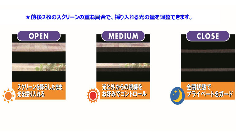 ボーダー柄のスクリーンが前後で重なり合い、上下に交差することで光の量を自在に調整できるロールスクリーンです。