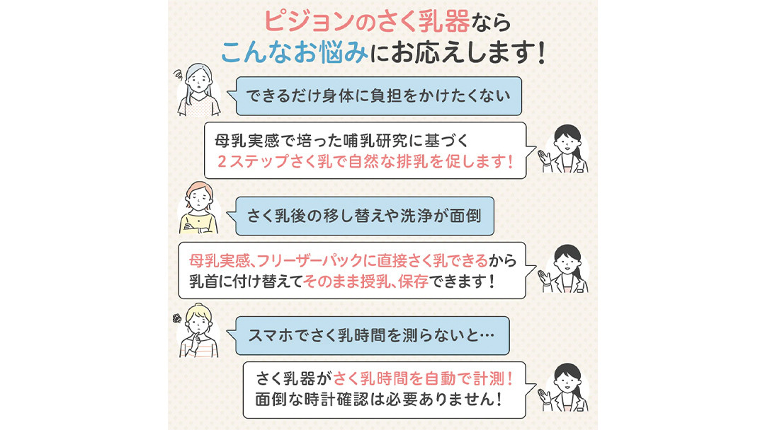 自然な流れでしっかり母乳がとれる2段階の「準備ステップ」と、その時のおっぱいの状態に合わせて強さが6段階に調節できる「さく乳ステップ」の2ステップで自然なさく乳ができます。