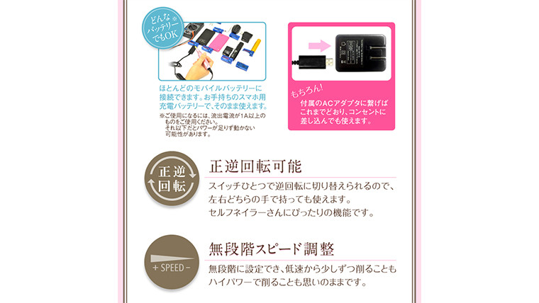 持つ手や用途に応じて回転方向が選べる「正逆回転」可能。
