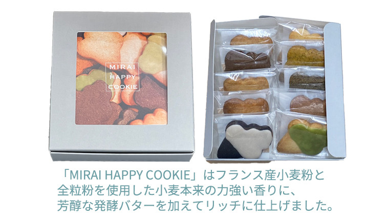 「MIRAI HAPPY COOKIE」はフランス産小麦粉と全粒粉を使用した小麦本来の力強い香りに、芳醇な発酵バターを加えてリッチに仕上げました。