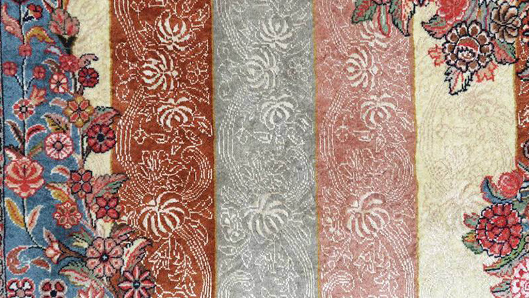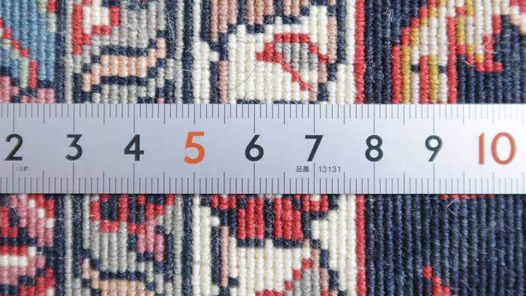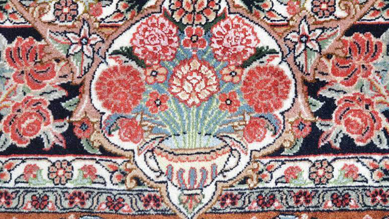 しっかりと肉厚で目の詰まった生地。シルク糸を多用した輝きのある最高級ランクの上質ペルシャ絨毯です。