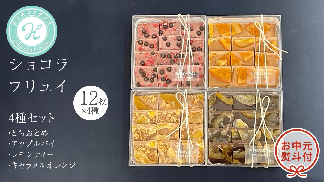 【 お中元 熨斗 付】 ショコラ フリュイ 4種セット( とちおとめ 、 アップルパイ 、 レモンティー 、 キャラメル オレンジ ) チョコレート チョコ スイーツ デザート 高級 ギフト 贈り物 お礼 プレゼント 手土産 お菓子