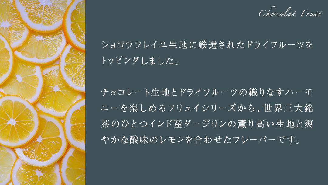 チョコレート生地とドライフルーツの織りなすハーモニーを楽しめるフリュイシリーズから、世界三大銘茶のひとつインド産ダージリンの薫り高い生地と爽やかな酸味のレモンを合わせたフレーバーです。