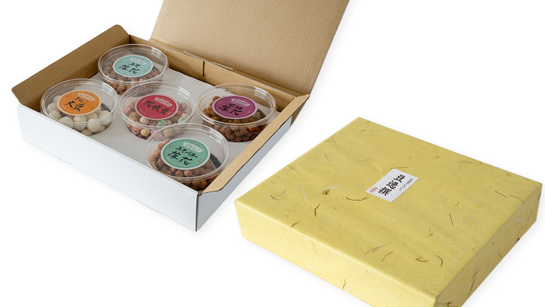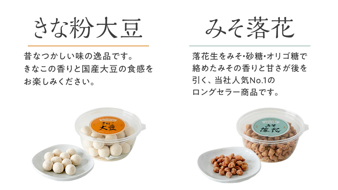 | 容量 | 640g (みそ落花150g×1、黒糖落花130g×1、きなこ大豆×100g×1、花咲豆130g×1、みそバター落花130g×1) |