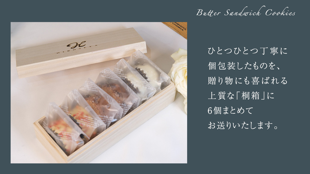 ひとつひとつ丁寧に個包装したものを、贈り物にも喜ばれる上質な「桐箱」に6個まとめてお送りいたします。
