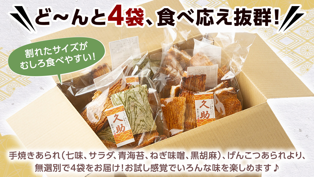 地域の生産者応援の品 チョイスPayポイントと交換できる品 【訳あり・数量限定】手焼き割れあられ詰め合わせ ≪ 久助 ≫ 4袋セット(計800g) 訳あり せんべい 煎餅 お徳用 割れ 割れ煎餅 割れせんべい われせんべい われ こわれ おかき 大袋