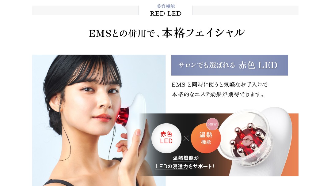 フェイスモード:EMS(引き締め)+赤色LED(美容ケア)+温熱