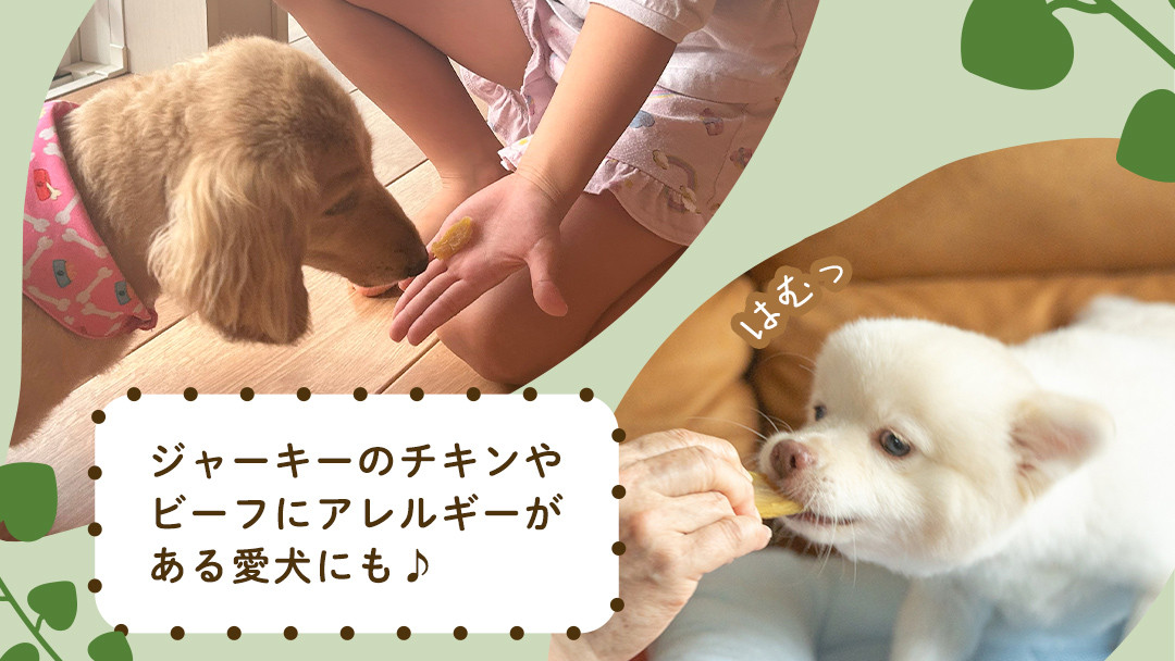 食物繊維たっぷり!ジャーキのチキンやビーフにアレルギーがある愛犬にどうぞ。