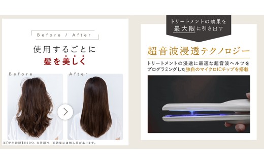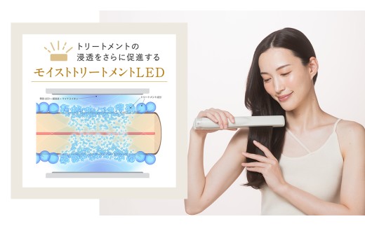 髪にトリートメント剤をつけて本機で挟むことで、トリートメント剤の浸透を高め、うるおいとツヤのある髪に導きます。