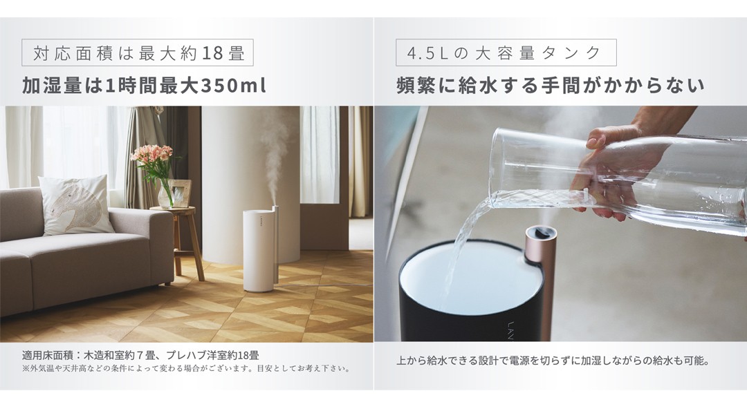 また、タンクは4.5Lと大容量なので、頻繁な給水は不要。給水時は運転中でも上部から水を足すことができます。