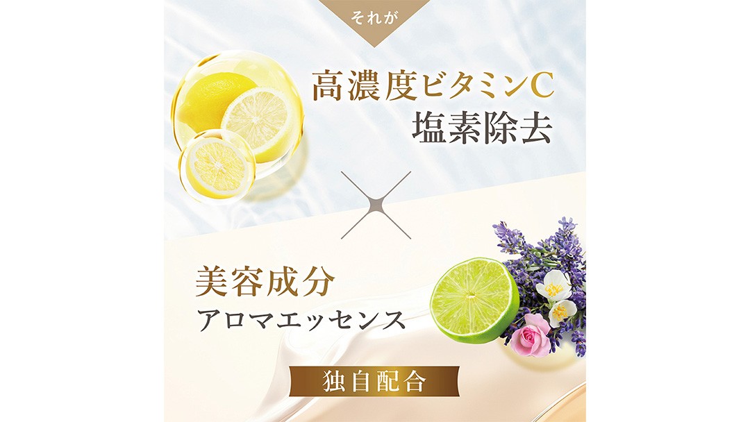 アロマエッセンス ビタミンシャワーフィルターは、ビタミンCの力で塩素を中和し、99.99%除去します。また、古い水道管を通ることで混入する水中のサビも除去。塩素やサビの入っていないピュアな水で髪や身体を洗うことができます。