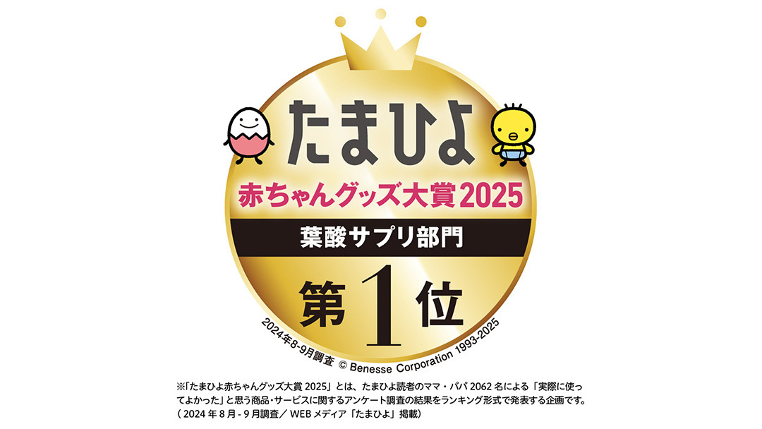 赤ちゃんのすこやかな発育に役立つ葉酸400μgと、鉄、カルシウム、ビタミンDなど合計6種のビタミン・ミネラル配合。