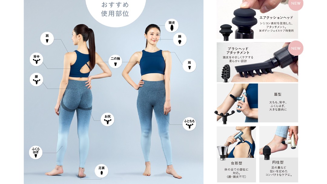 新登場の「エアクッションヘッド」はシリコン素材で、ケアしたい局部に対して優しくアプローチ。内部に空気を含んでいるため、強い力がかかりにくく、顔や首などの繊細なパーツにぴったり。頭皮ケア用の「ブラシヘッド」の先端が丸みを帯びて柔らかいので、頭皮に沿ってフィット。適度な刺激が心地よく、気軽にできるヘッドスパのような感覚で楽しめます。その他、肩より下の全ての部位に対応する『台形型』、太ももや背中、ふくらはぎなどの大きな筋肉に最適な『扇型』、足の裏や手のひらなど狙いを定めスポットのケアにうってつけな『円柱型』を含め、5種のヘッドで全身に適材適所でお使いいただけます。