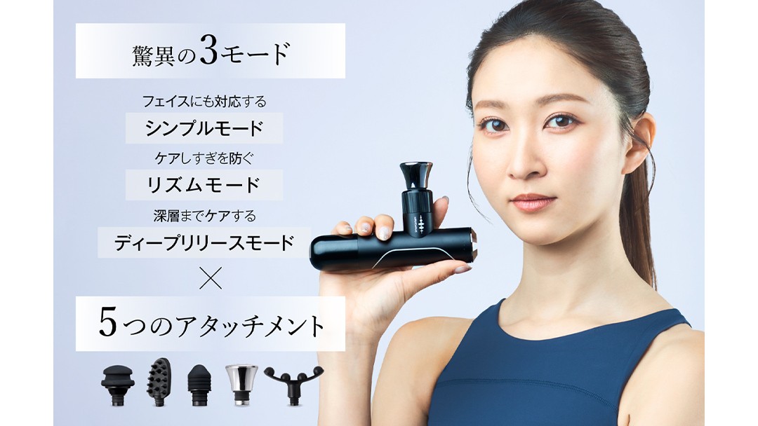 新登場の「エアクッションヘッド」はシリコン素材で、ケアしたい局部に対して優しくアプローチ。内部に空気を含んでいるため、強い力がかかりにくく、顔や首などの繊細なパーツにぴったり。頭皮ケア用の「ブラシヘッド」の先端が丸みを帯びて柔らかいので、頭皮に沿ってフィット。適度な刺激が心地よく、気軽にできるヘッドスパのような感覚で楽しめます。その他、肩より下の全ての部位に対応する『台形型』、太ももや背中、ふくらはぎなどの大きな筋肉に最適な『扇型』、足の裏や手のひらなど狙いを定めスポットのケアにうってつけな『円柱型』を含め、5種のヘッドで全身に適材適所でお使いいただけます。