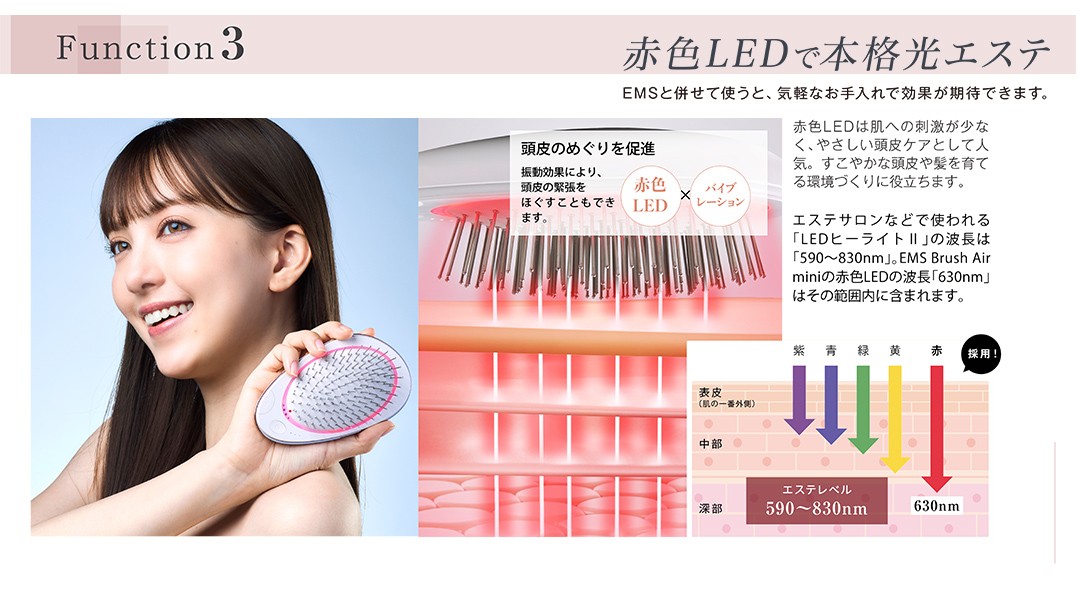 刺激の少ないやさしい光で、頭皮環境を整えるサロン感覚のケアが可能。EMSと併用することで、本格的なエステ効果を期待でき、毎日の短時間ケアでも内側から美しいサラサラ髪を実感できます