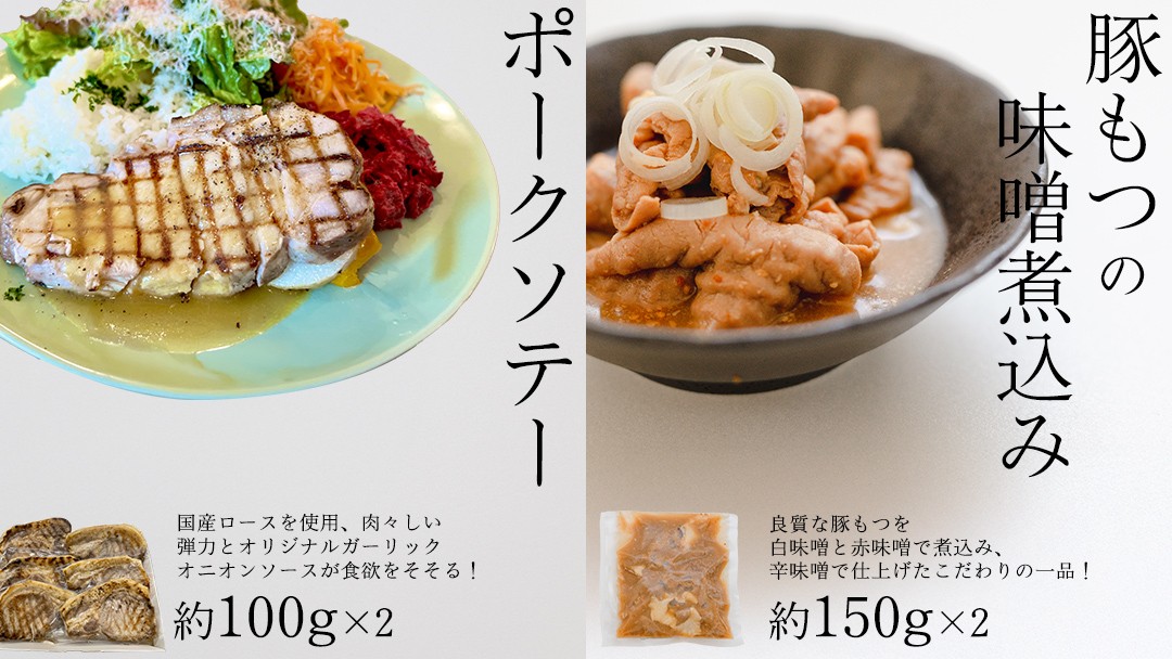 | 容量 | ポークソテー(約100g×2枚) 豚もつの味噌煮込み(約150g×2) |