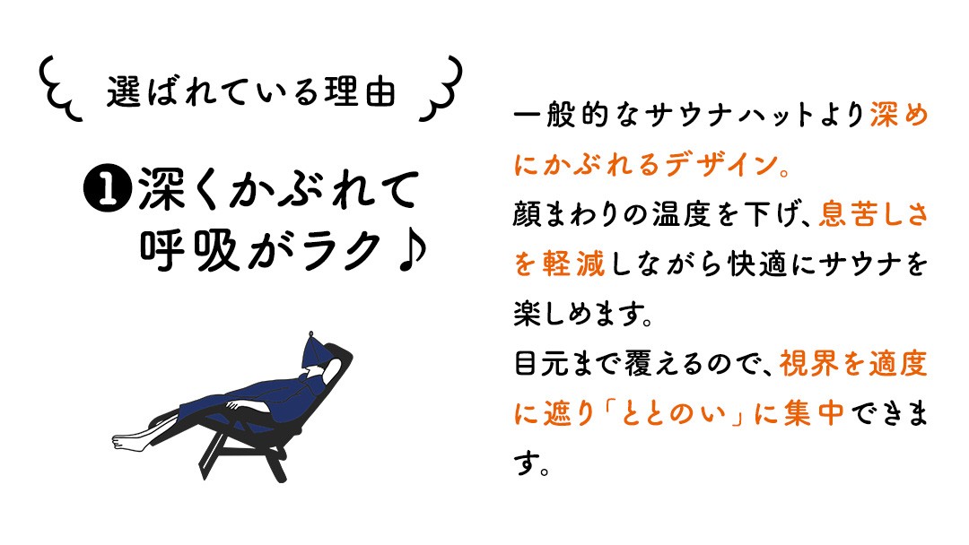 また、深めにかぶれるデザインで顔まわりの温度を下げ、呼吸も快適に。視界を適度に遮ることで、集中して「ととのい体験」を楽しめます。