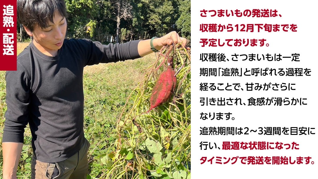 2025年12月から追熟が完了しだい順次発送開始 発送は、注文をいただいてから順次行いますが、天候や生育状況により発送時期が多少前後する場合がございます。 最もおいしい状態でお届けするために、品質管理を徹底し、皆様の食卓に最高のさつまいもをお届けできるよう、細心の注意を払って対応いたします。 ※配送できない地域がございます※ 北海道・沖縄・その他離島 さつまいもの発送は、収穫から12月下旬までを予定しております。 収穫後、さつまいもは一定期間「追熟」と呼ばれる過程を経ることで、甘みがさらに引き出され、食感が滑らかになります。 追熟期間は2~3週間を目安に行い、最適な状態になったタイミングで発送を開始します。 |