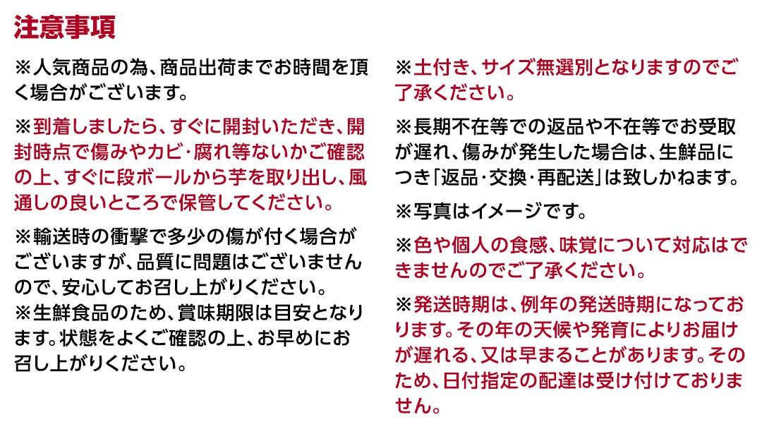 ※到着しましたら、すぐに開封いただき、開封時点で傷みやカビ・腐れ等ないかご確認の上、すぐに段ボールから芋を取り出し、風通しの良いところで保管してください。