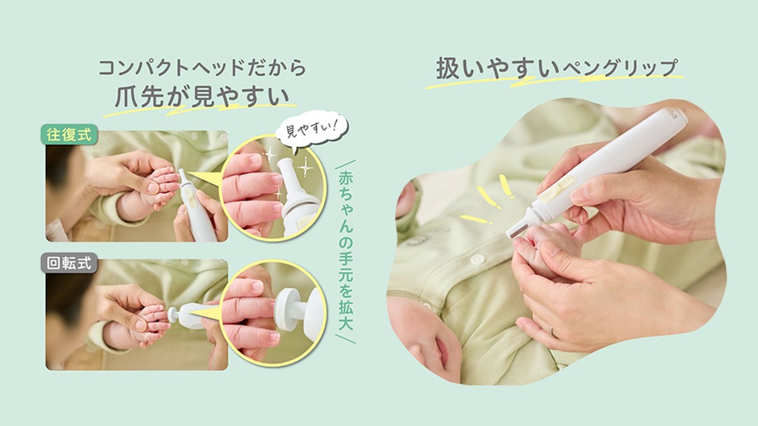 コンパクトヘッドだから、赤ちゃんの小さなつめの1本1本を確認しながら、削りすぎることなくケアできます。