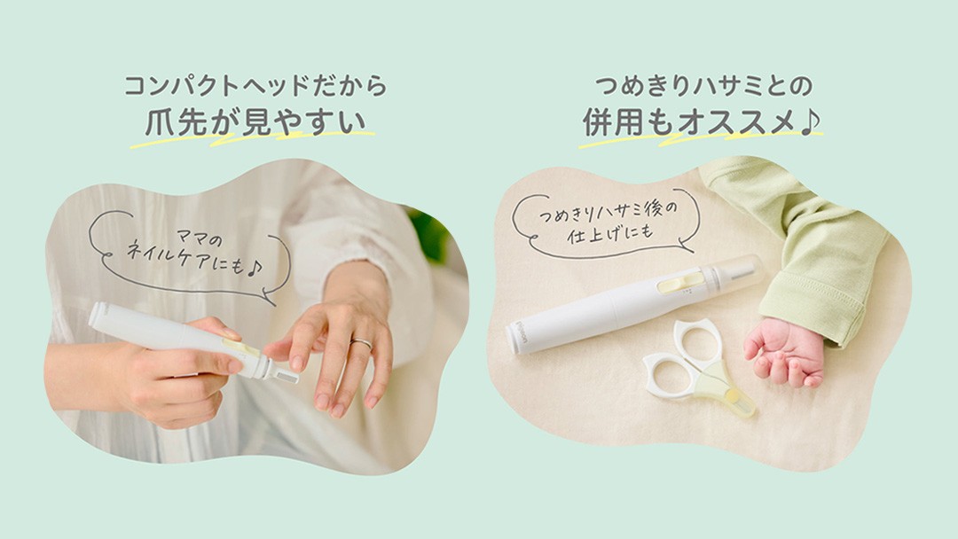 新生児の柔らかいつめでもなめらかに仕上げられる「ベビー電動つめやすり」。