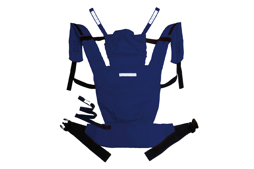 両肩と腰の3点で支えるしっかりタイプの避難用抱っこひも。