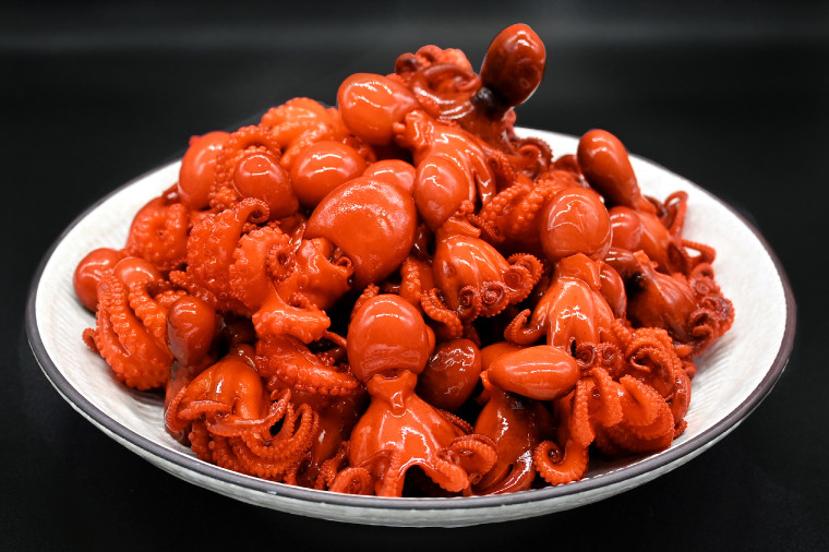 1匹ずつたこ頭の中より墨と砂等を除去後水洗し、専用大型樽にて塩もみ。そのあとボイル・冷却したのち、やまさん商店特製のタレにてじっくり漬け込みました。