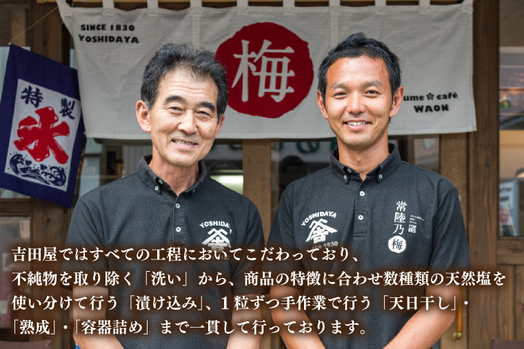 吉田屋ではすべての工程においてこだわっており、不純物を取り除く「洗い」から、商品の特徴に合わせ数種類の天然塩を使い分けて行う「漬け込み」、1粒ずつ手作業で行う「天日干し」・「熟成」・「容器詰め」まで一貫して行っております。