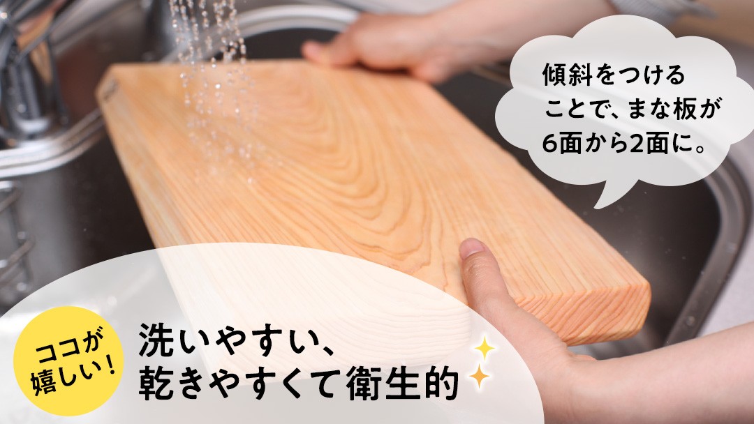 まな板はご使用前にさっと水をかけて表面に水分を含ませておくことで、汚れやにおいの沁み込みを軽減できます。
