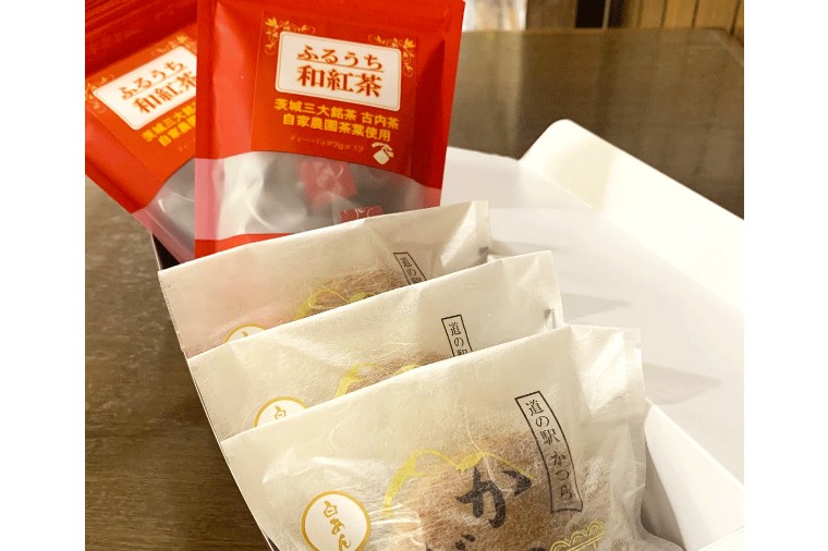 茨城三大銘茶のひとつ「古内茶」を使用した和紅茶と、昔懐かしいどらやきのセット。 和紅茶とかつどら3個セット【白あん】 (AF057)
