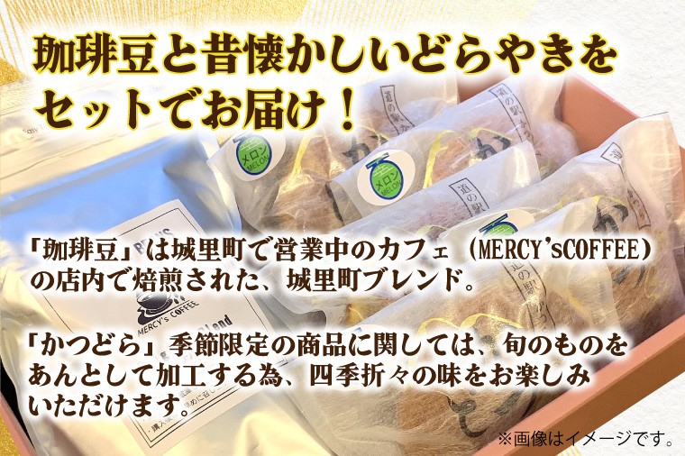 MERCY's COFFEEのオリジナルブレンドと昔懐かしいどらやきのセット。 珈琲豆とかつどら5個【城里町ブレンド/あんバター】(AF078)