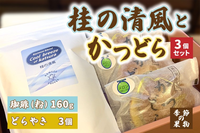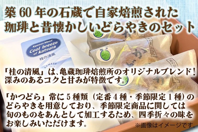 築60年の石蔵で自家焙煎された珈琲と昔懐かしいどらやきのセット。 珈琲とかつどら3個セット【桂の清風(粉)/季節の果物】(AF088)