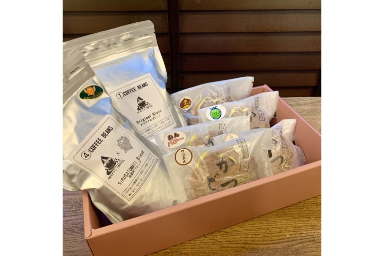 城里町で営業中のカフェ《MERCY's COFFEE》の店内で焙煎されたオリジナルブレンド・城里町ブレンド(珈琲豆)と、かつどらをセットでお届けします。