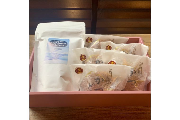 同じ城里町で営業中の亀蔵珈琲焙煎所オリジナルブレンド、深みのあるコクと甘みが特徴の“桂の清風”と、かつどら(栗/こしあん)をセットでお届けします。