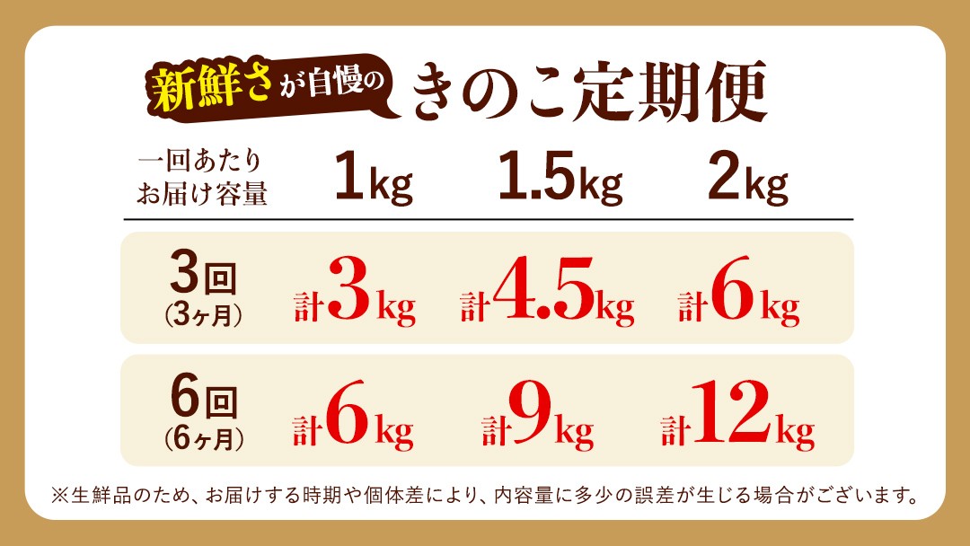 | 容量 | ▼内容量とお届け回数をお選びください 【内容量】 ・きのこ詰め合わせ S 約1kg ・きのこ詰め合わせ M 約1.5kg ・きのこ詰め合わせ L 約2kg 【お届け回数】 ・1回 ・3回(定期便:3ヶ月連続お届け) ・6回(定期便:6ヶ月隔月お届け) |