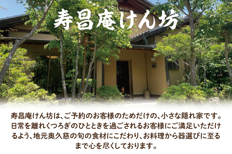 寿昌庵けん坊は、ご予約のお客様のためだけの、小さな隠れ家です。 日常を離れくつろぎのひとときを過ごされるお客様にご満足いただけるよう、地元奥久慈の旬の食材にこだわり、お料理から器選びに至るまで心を尽くしております。 【予約・利用方法について】 1.お申し込み後に招待券(2名様分)を送らせていただきます。 2.飲食店に事前に直接ご予約をお願いいたします。 ※ご予約の際には招待券を使用する旨を必ずお伝えください。 3.当日、受付の際には招待券を忘れずにご持参ください。 ◆返礼品について 【注意事項】 ※画像はイメージです。 ※有効期限はありません。