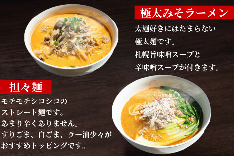極太手もみ麺のみそ、中太ストレートの担々麺、中太手もみ麺の鶏白湯、細麺ストレートのしょうゆ、それぞれの麺に合うスープを厳選しました。
