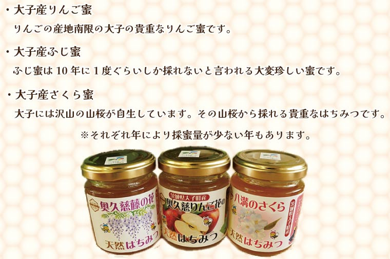 | 容量 | ・大子産りんご蜜 120g×1本 ・大子産ふじ蜜 120g×1本 ・大子産さくら蜜 120g×1本 |
