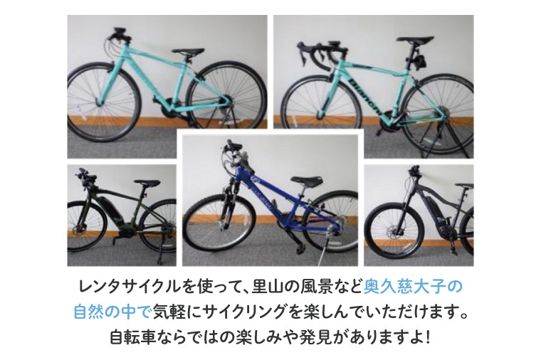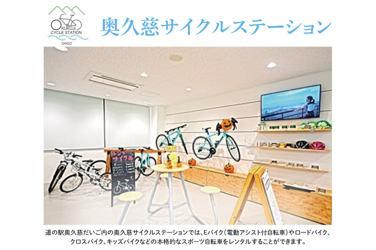 道の駅にクルマを停めて、自転車で大子の街と自然を巡る旅はいかがですか? 道の駅奥久慈だいご内の奥久慈サイクルステーションでは、Eバイク(電動アシスト付自転車)やロードバイク、クロスバイク、キッズバイクなどの本格的なスポーツ自転車をレンタルすることができます。 レンタサイクルを使って、里山の風景など奥久慈大子の自然の中で気軽にサイクリングを楽しんでいただけます。 自転車ならではの楽しみや発見がありますよ! <インフォメーション> ■利用時間:9時から17時 休館日:1月1日 ※温泉は毎月第1・第3水曜日 ■住所:茨城県久慈郡大子町池田2830-1 ■電話:0295-72-6111 ■アクセス案内 大子市街へ向かう国道118号「袋田の滝入口」を過ぎて約5分のところにあります。 JR水郡線「常陸大子駅」からは国道461号で徒歩10分です。 ■駐車場:85台 【有効期限】 発行日より1年 【配送不可地域】 沖縄・離島 【注意事項】 ※画像はイメージです。 ※沖縄県・離島への配送は出来ない商品となります。 ※上記のエリアからの申し込みは返礼品の手配が出来ないため、「キャンセル」または「寄附のみ」とさせていただきます。予めご了承ください。 < レンタサイクルご利用の注意点 > ・ご利用時間は9:00~17:00までです。 ・自転車を離れる時は必ず鍵をかけ盗難に遭わないように十分ご注意ください。 ・次の方が気持ちよくご利用いただけるよう、大切にお乗りください。 ・ご利用中の事故等につきましては、一切の責任を負いかねます。予めご了承ください。 ・ご利用中にお困りのことがありましたら、道の駅 奥久慈だいごまでお電話ください。