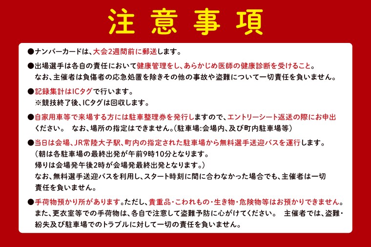 ・当日は会場、JR常陸大子駅、町内の指定された駐車場から無料選手送迎バスを運行します。(朝は各駐車場の最終出発が午前9時10分となります。帰りは会場発午後2時が会場発最終出発となります。)なお、無料選手送迎バスを利用し、スタート時刻に間に合わなかった場合でも、主催者は一切責任を負いません。
