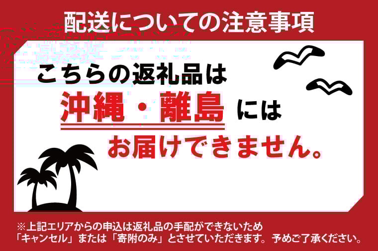 ※上記のエリアからの申し込みは返礼品の手配が出来ないため、「キャンセル」または「寄附のみ」とさせていただきます。予めご了承ください。