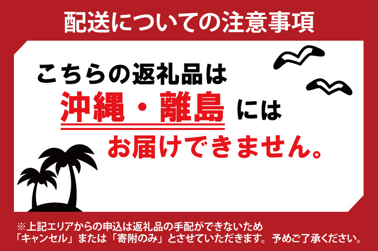 ※上記のエリアからの申し込みは返礼品の手配が出来ないため、「キャンセル」または「寄附のみ」とさせていただきます。予めご了承ください。