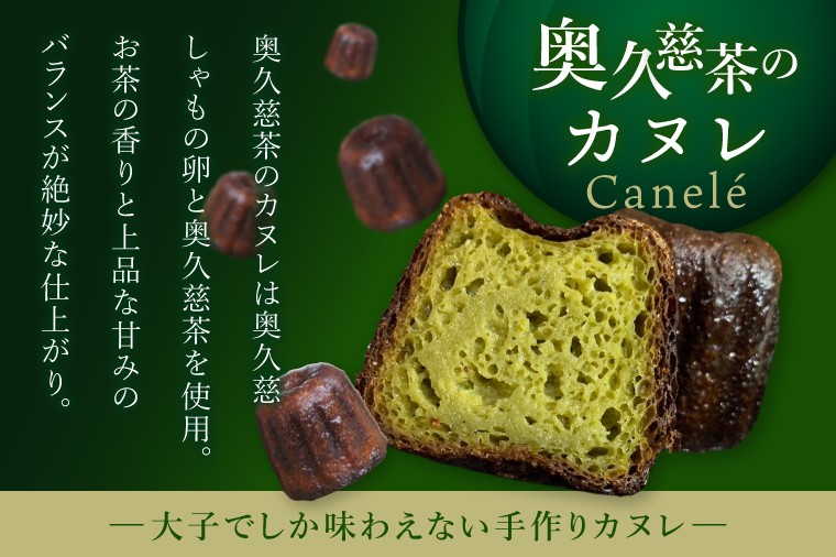奥久慈茶のカヌレは奥久慈しゃもの卵と奥久慈茶を使用しています。