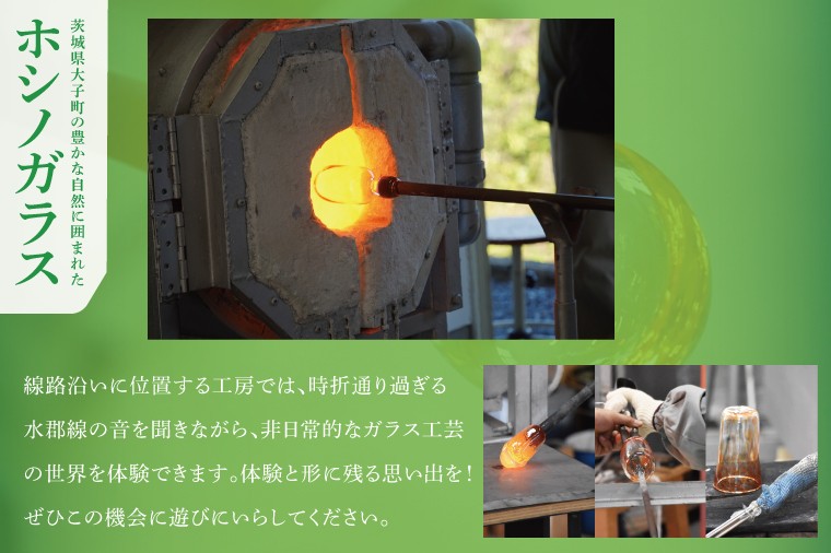 体験と形に残る思い出を!ぜひこの機会に遊びにいらしてください。 ホシノガラス 吹きガラス体験(1名様)|茨城県 大子町 体験工房 ガラス工芸 オリジナル ハンドメイド 手作り グラス コップ 小鉢 一輪挿し 綺麗 おしゃれ かわいい (CV001)