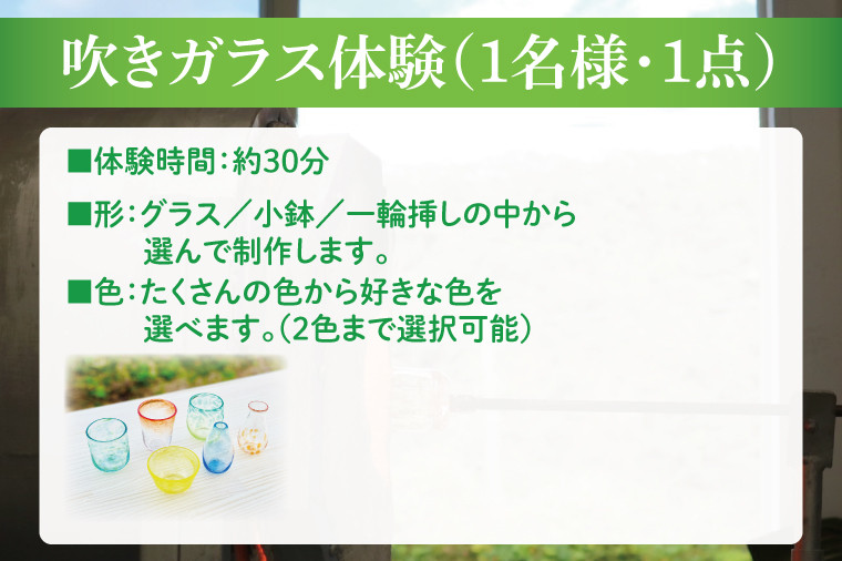 | 容量 | ■吹きガラス体験(1名様・1点) 体験時間:約30分 形:グラス/小鉢/一輪挿しの中から選んで制作します。 色:たくさんの色から好きな色を選べます。(2色まで) ※制作した作品は、当日お持ち帰りができません。 翌日以降のお受け取り又は発送でのお渡しとなります。(送料は別料金です) |