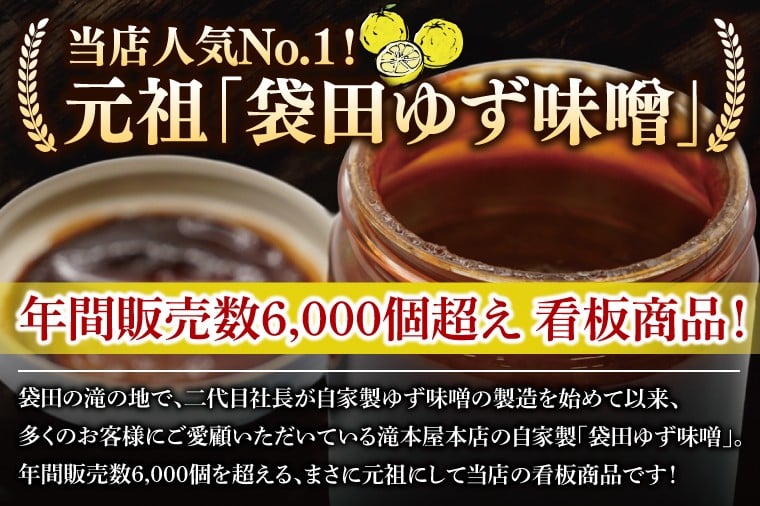 袋田の滝の地で、二代目社長が自家製ゆず味噌の製造を始めて以来、多くのお客様にご愛顧いただいている滝本屋本店の自家製「袋田ゆず味噌」。年間販売数6,000個を超える、まさに元祖にして当店の看板商品です!