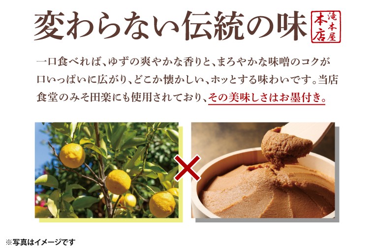 一口食べれば、ゆぞの爽やかな香りと、まろやかな味噌のコクが口いっぱいに広がり、どこか懐かしい、ホッとする味わいです。当店食堂のみそ田楽にも使用されており、その美味しさはお墨付き。