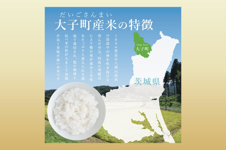 大子町のコシヒカリは他地域と比べて、粒が大きいので口に入れたときの食感の良さと噛んだときに広がる強いうま味と飲み込んだ後に残る甘みがコンテストにおいては評価されています。粒が大きく粘りも強いので、冷めても美味しく召し上がれるのも大子町のコシヒカリの特徴です。