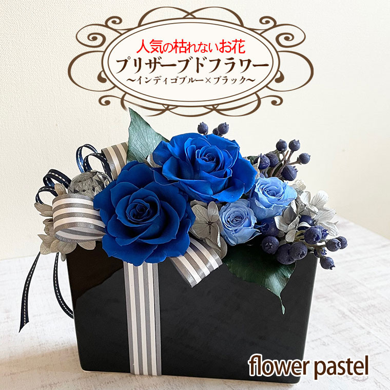 モダンでスタイリッシュな美しいアレンジです。ギフト用にもおススメです。 人気の枯れないお花! プリザーブドフラワー ~インディゴブルー×ブラック~ 【flower pastel】 母の日 [BB002ya]