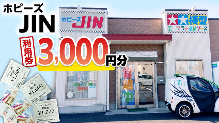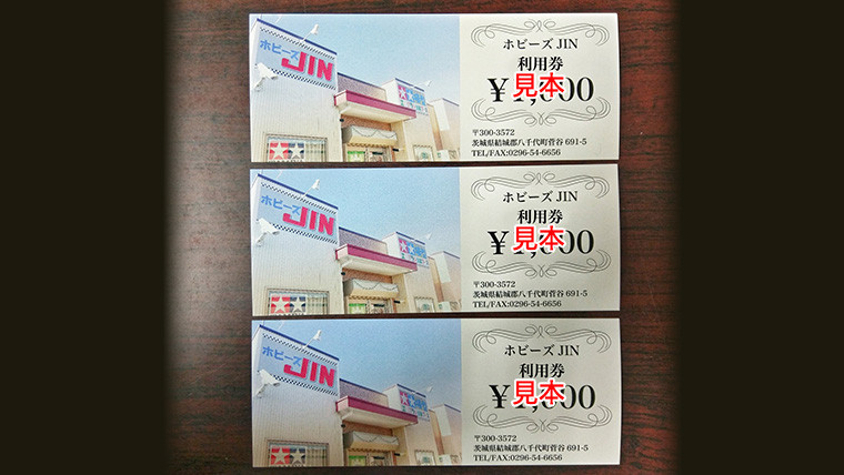 茨城県八千代町にある人気の模型店「ホビーズJIN」の利用券3,000円分(1,000円券×3枚)です。